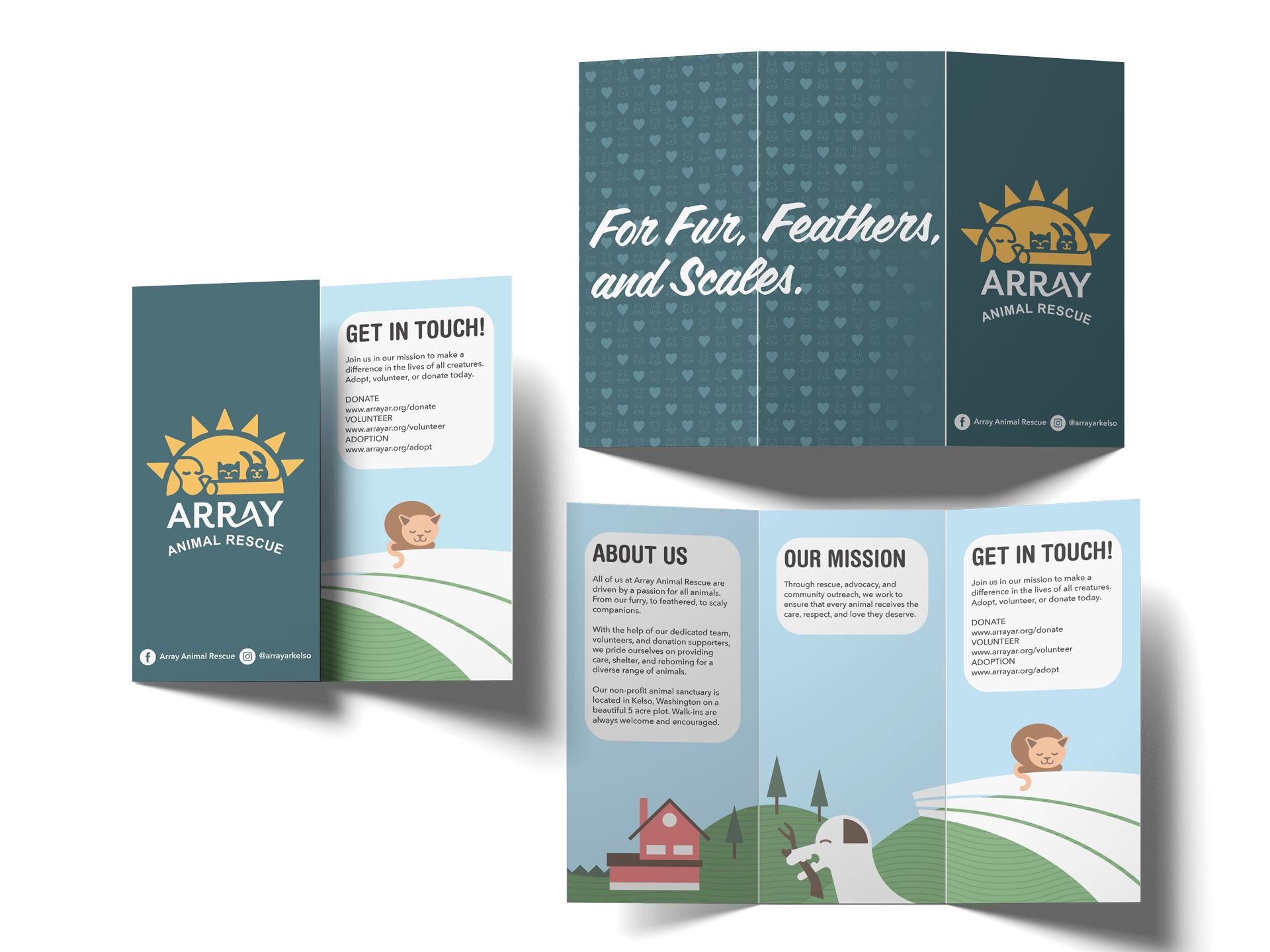 Established in 2023, Array Animal Rescue is a non-profit animal rescue based in Kelso, WA. I was hired to produce a logo, logotype, an apparel design, and a promotional brochure for up and coming company.